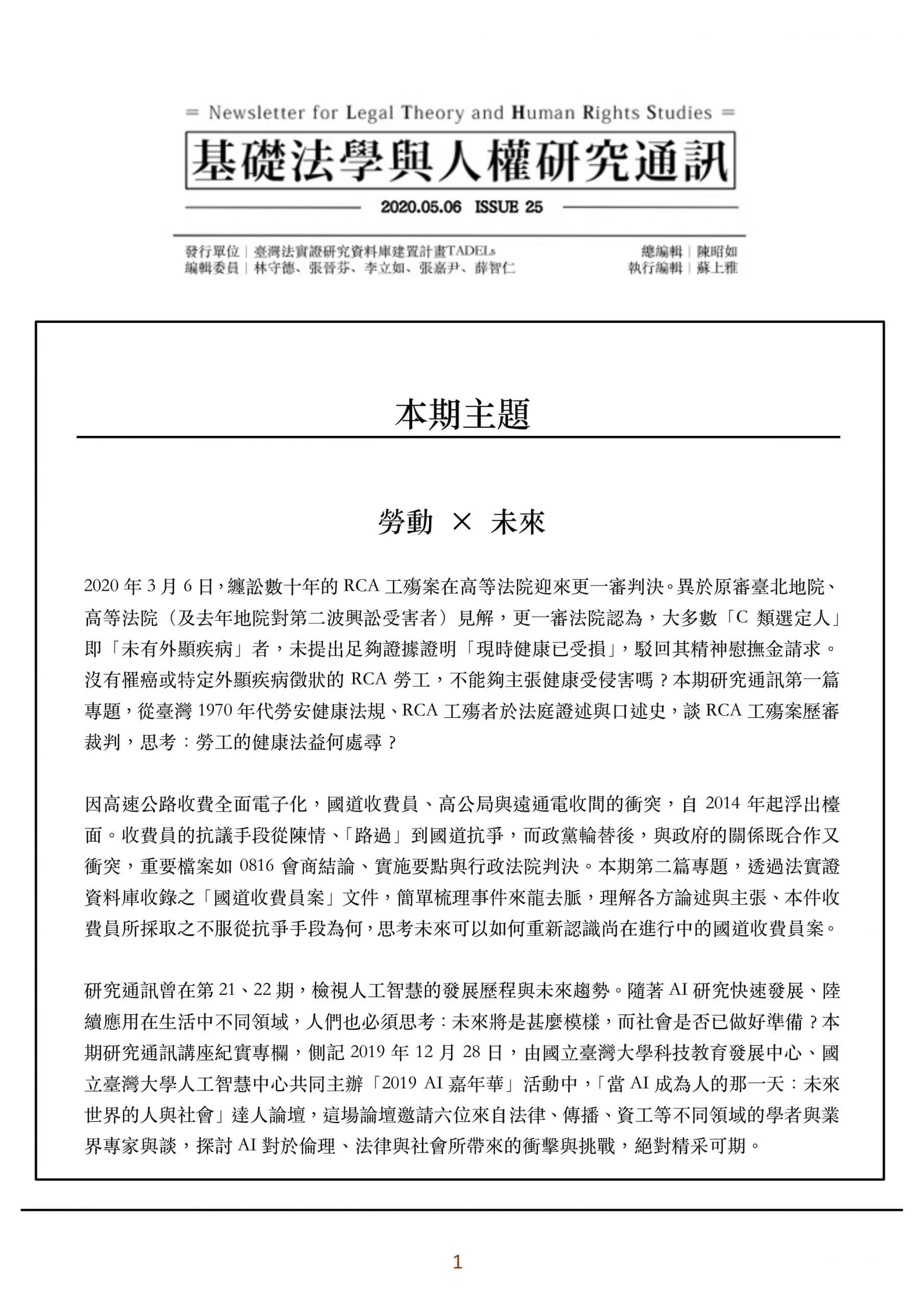 第 25 期 基礎法學與人權研究通訊第25期 關鍵字:2020, AI, RCA工殤案, 國道收費員爭議 2020 年 3 ⽉ 6 ⽇,纏訟數⼗年的 RCA ⼯殤案在⾼等法院迎來更⼀審判決。異於原審臺北地院、⾼等法院(及去年地院對第⼆波興訟受害者)⾒解,更⼀審法院認為,⼤多數「C 類選定⼈」即「未有外..