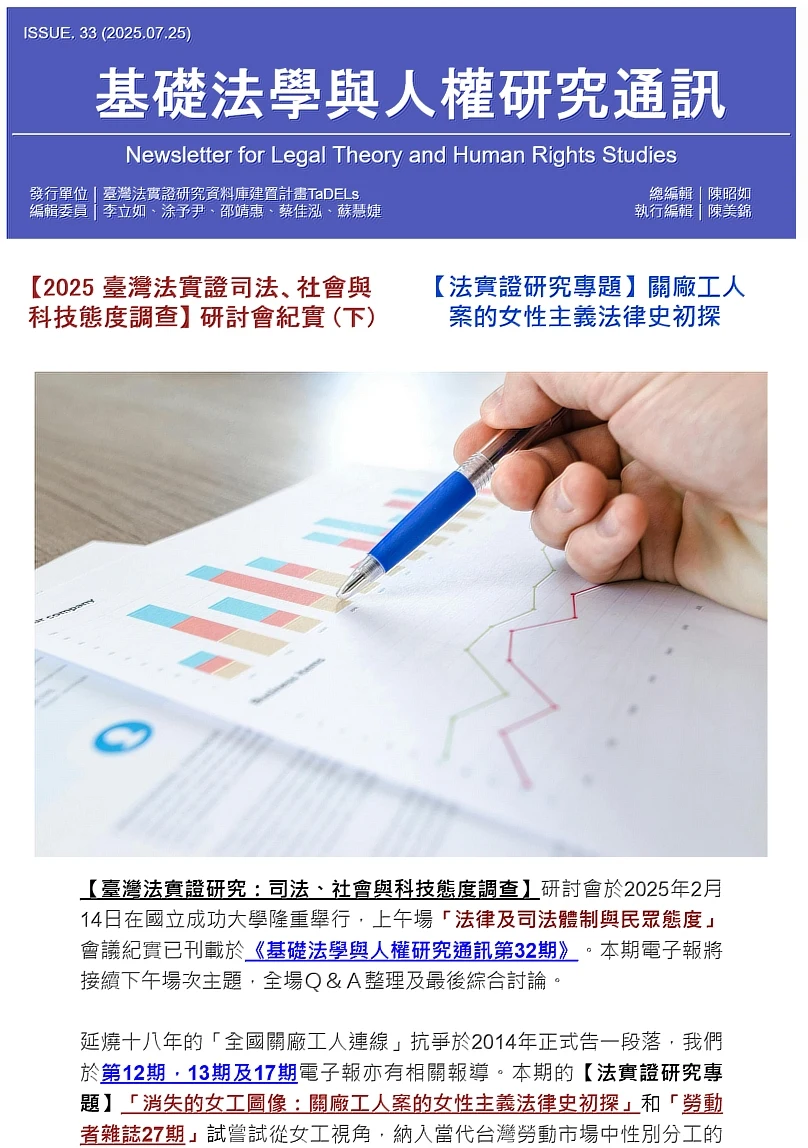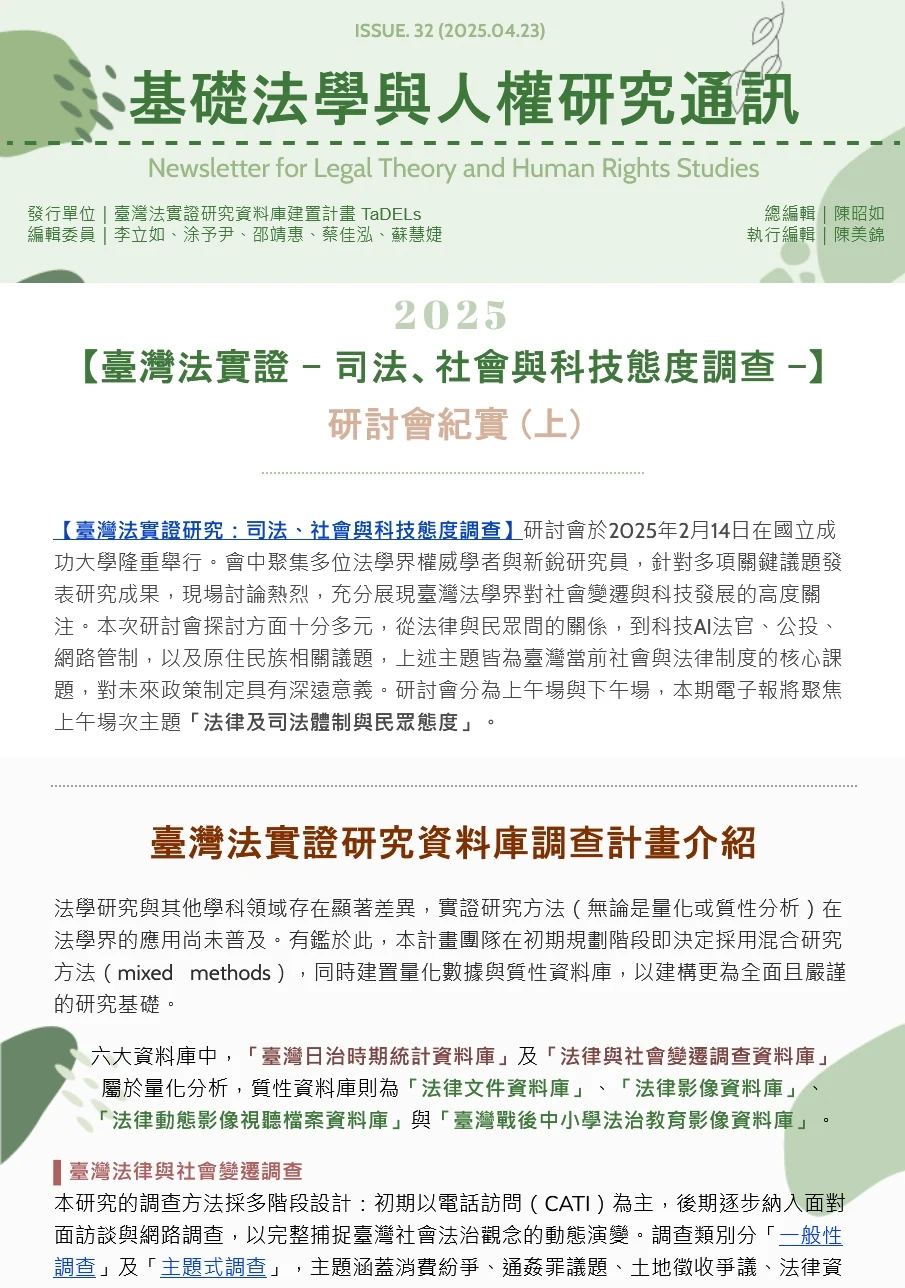 第 32 期 基礎法學與人權研究通訊第32期 關鍵字:2025, 公投, 原住民, 司法改革, 國民法官, 法律與社會變遷調查, 法意識, 網路言論, 能源 【臺灣法實證研究:司法、社會與科技態度調查】研討會於2025年2月14日在國立成功大學隆重舉行。現場討論熱烈,充分展現臺灣法學界對社會變遷與科技發展的高度關注。
