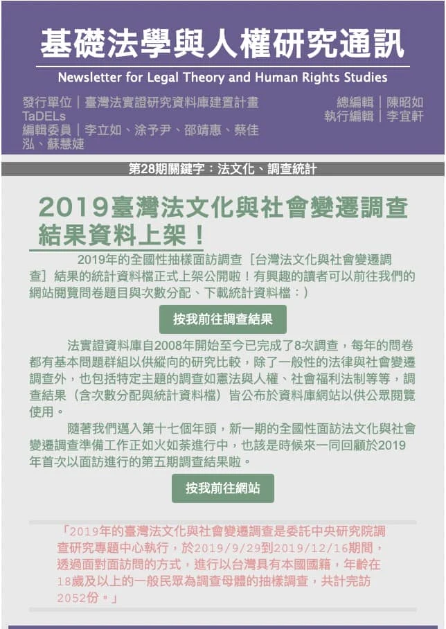 第 28 期 基礎法學與人權研究通訊第28期:2019臺灣法文化與社會變遷調查 關鍵字:2023, 法律與社會變遷調查, 法意識 2019臺灣法文化與社會變遷調查結果資料上架!2019年的全國性抽樣面訪調查[台灣法文化與社會變遷調查]結果的統計資料檔正式上架公開啦!有興趣的讀者可以前往我…….